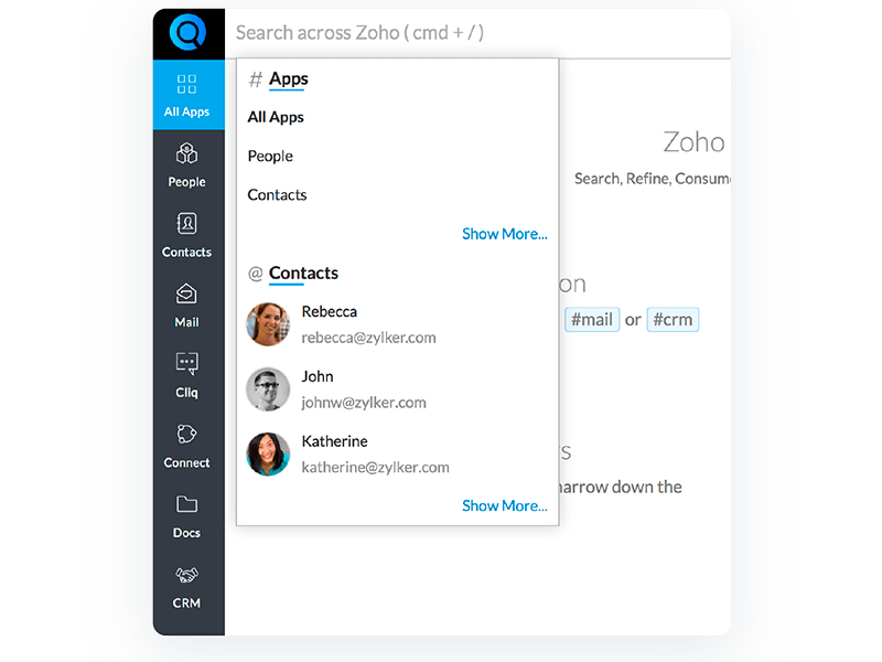 Se você usar vários produtos Zoho (e, francamente, você deveria), a pesquisa global o ajudará a encontrar coisas em todos os seus aplicativos Zoho. Por exemplo, se pesquisar “Patrícia”, você poderá encontrar e-mails dela no Zoho Mail, documentos criados por ela no Zoho Docs, chats com ela no Zoho Chat e até mesmo o perfil dela no Zoho People.