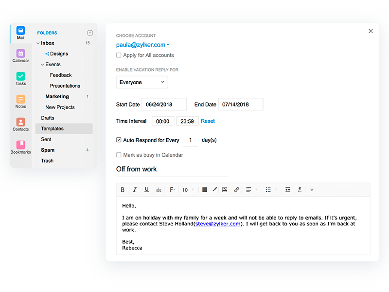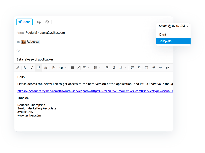 O Zoho Mail permite criar modelos e-mail reutilizáveis para e-mails que você envia repetidamente. Por exemplo, caso envie um e-mail a todos os seus colegas no final de cada mês solicitando um relatório de projeto, você poderá fazer o rascunho do e-mail apenas uma vez, salvá-lo como um modelo e usá-lo sempre que quiser enviar o e-mail.