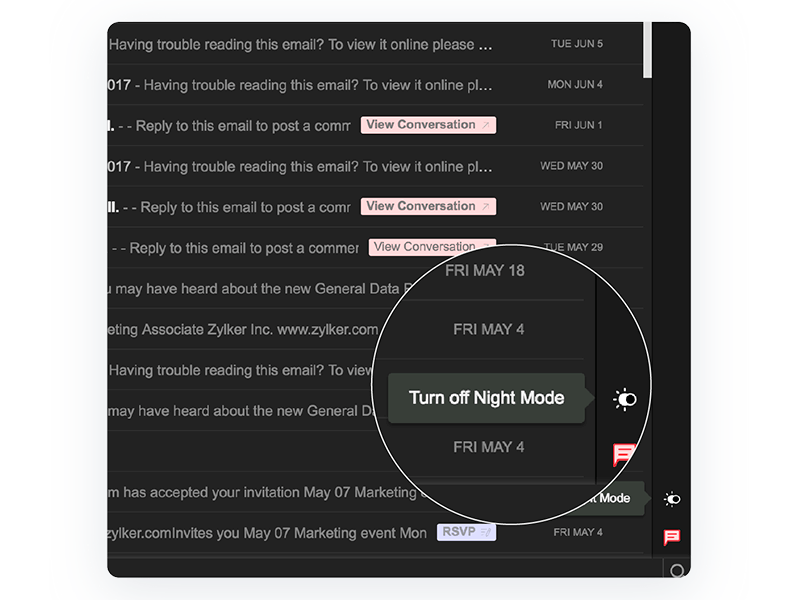 Não deixe que uma tela brilhante no escuro incomode a sua vista cansada. Alterne para o “Modo Noturno”. Este tema escuro no Zoho Mail permite que você visualize seus e-mails de maneira confortável à noite..