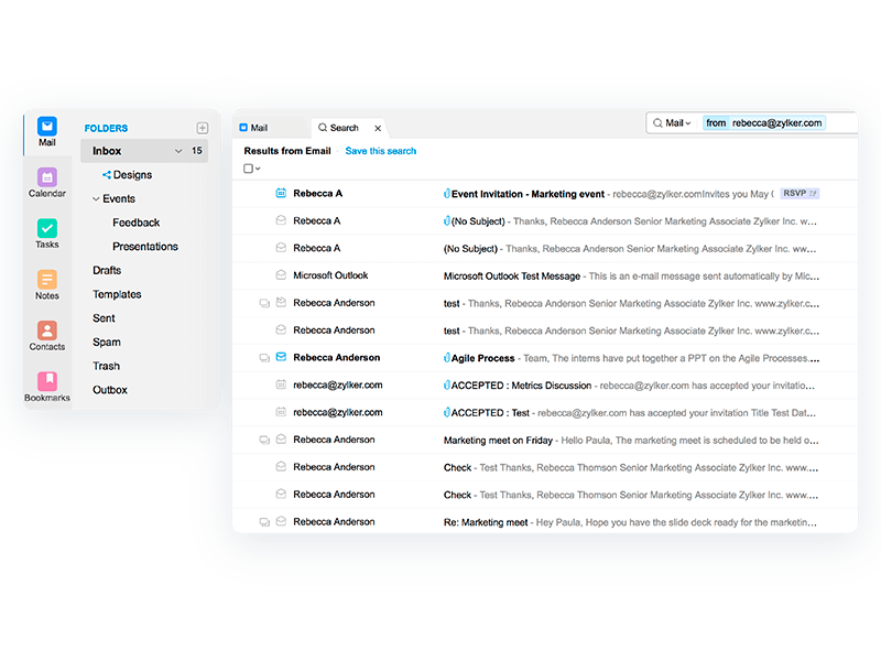 A pesquisa avançada do Zoho Mail permite localizar rapidamente o e-mail que você está procurando, mesmo que ele esteja perdido no meio da caixa de entrada. Sabe aquele e-mail vago de Jennifer na agência de publicidade de sete meses atrás? Não tem problema. Você pode pesquisar usando todos os detalhes que souber. Caso esteja procurando uma mensagem na pasta Clientes entre 1° e 20 de maio com anexos contendo a palavra “proposta”, temos tudo o que você precisa